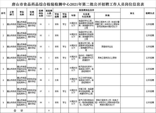 2、唐山市食品藥品綜合檢驗(yàn)檢測(cè)中心面向社會(huì)公開招聘事業(yè)編制工作人員8名。