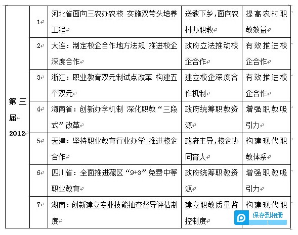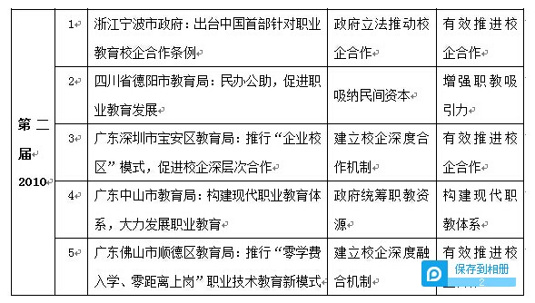 從2008年開始,“地方職業(yè)教育制度創(chuàng)新獎”評選已有三屆,經(jīng)過6年時間的發(fā)展,我們明顯看到,一些地方政府堅持職業(yè)教育制度創(chuàng)新所取得的突出成績。比如,浙江省教育廳、勞動與社會保障廳于2008年聯(lián)合發(fā)文進(jìn)行“職業(yè)教育‘雙元制’試點改革”,成功構(gòu)建了“五個雙元”:雙元招生,雙元計劃,雙元師資,雙元管理與評價,雙證書,經(jīng)過5年實踐,開辟了“校企合作”新模式,在實踐中取得了突出成效。