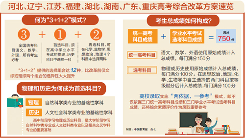 根據公布的實施方案,8省份的方案為“3+1+2”模式,即“3”為全國統(tǒng)考科目語文、數學、外語,所有學生必考;“1”為首選科目,考生須在高中學業(yè)水平考試的物理、歷史科目中選擇一科;“2”為再選科目,考生可在化學、生物學、思想政治、地理4個科目中選擇兩科。