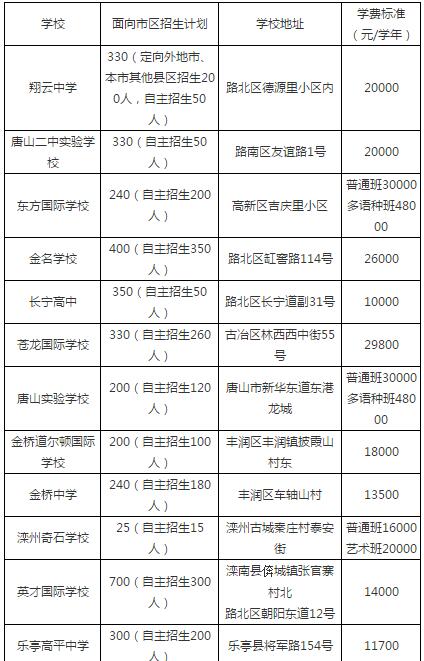 實行統(tǒng)一招生和自主招生相結(jié)合的學(xué)校包括:民辦翔云中學(xué)、唐山二中實驗學(xué)校、英才國際學(xué)校、金橋中學(xué)、金橋道爾頓國際學(xué)校、東方國際學(xué)校、蒼龍國際學(xué)校、長寧高中、金名學(xué)校、唐山實驗學(xué)校、灤縣奇石中學(xué)、樂亭高平中學(xué);