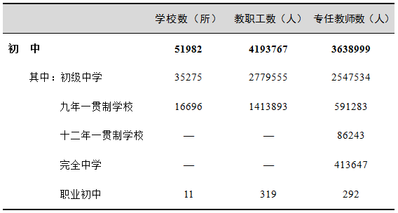 表2 初中學(xué)校數(shù)、教職工、專任教師情況