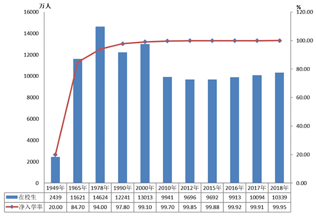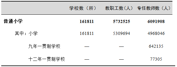 全國(guó)共有普通小學(xué)16.18萬(wàn)所,比上年減少0.52萬(wàn)所,下降3.11%。另有小學(xué)教學(xué)點(diǎn)10.14萬(wàn)個(gè),比上年減少0.16萬(wàn)個(gè)。招生1867.30萬(wàn)人,比上年增加100.74萬(wàn)人,增長(zhǎng)5.70%;在校生10339.25萬(wàn)人,比上年增加245.56萬(wàn)人,增長(zhǎng)2.43%;畢業(yè)生1616.49萬(wàn)人,比上年增加50.59萬(wàn)人,增長(zhǎng)3.23%。小學(xué)學(xué)齡兒童凈入學(xué)率[6]達(dá)到99.95%。