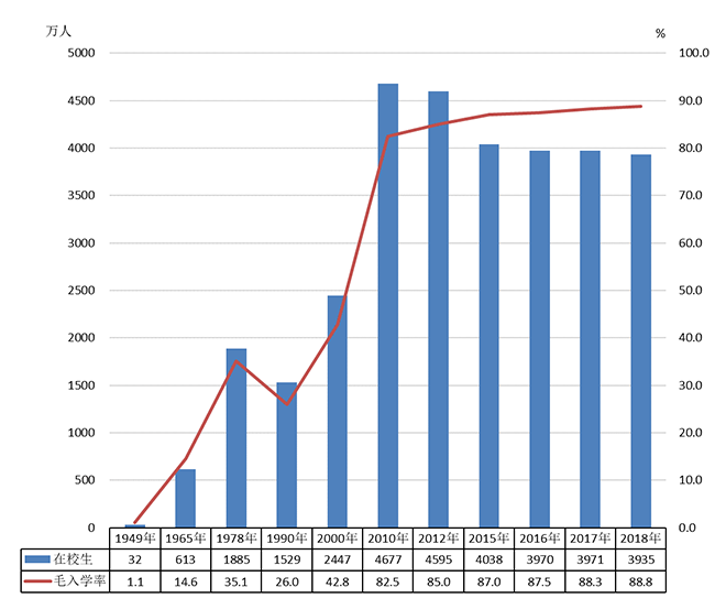 [4]毛入學(xué)率,是指某一級(jí)教育不分年齡的在校學(xué)生總數(shù)占該級(jí)教育國(guó)家規(guī)定年齡組人口數(shù)的百分比。由于包含非正規(guī)年齡組(低齡或超齡)學(xué)生,毛入學(xué)率可能會(huì)超過(guò)100%。