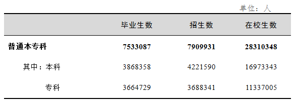 普通本??普猩?/span>790.99萬(wàn)人,比上年增加29.50萬(wàn)人,增長(zhǎng)3.87%;在校生2831.03萬(wàn)人,比上年增加77.45萬(wàn)人,增長(zhǎng)2.81%;畢業(yè)生753.31萬(wàn)人,比上年增加17.48萬(wàn)人,增長(zhǎng)2.38%。