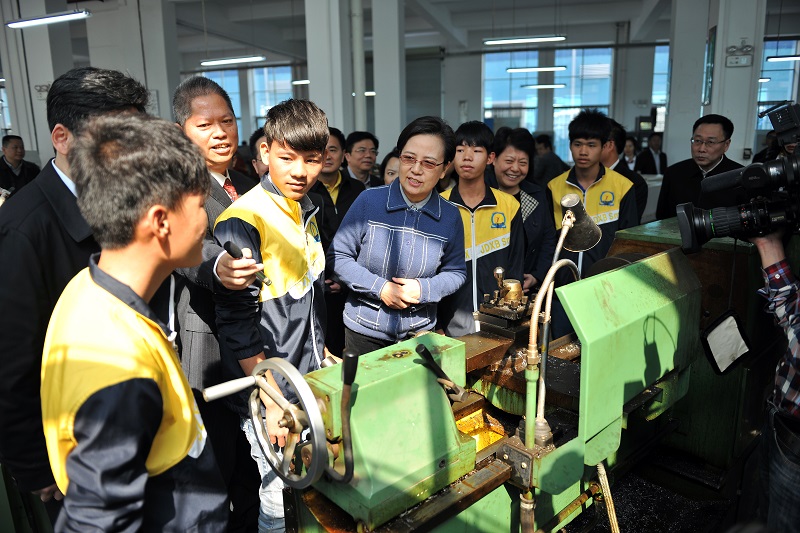 11月19日,教育部副部長魯昕一行來到廣西欽州市職業(yè)教育中心和北海市職業(yè)教育園區(qū)調(diào)研。她認真聽取了兩地關(guān)于職業(yè)教育教學改革的介紹,詳細詢問了職教中心和園區(qū)學校學生生源、招生情況、課程設(shè)置、中高職立交橋搭建以及現(xiàn)代職業(yè)教育體系構(gòu)建的情況等,每走到一處都與學生細心交流,詳細了解他們上中職的學習生活情況。廣西壯族自治區(qū)副主席李康一同調(diào)研。