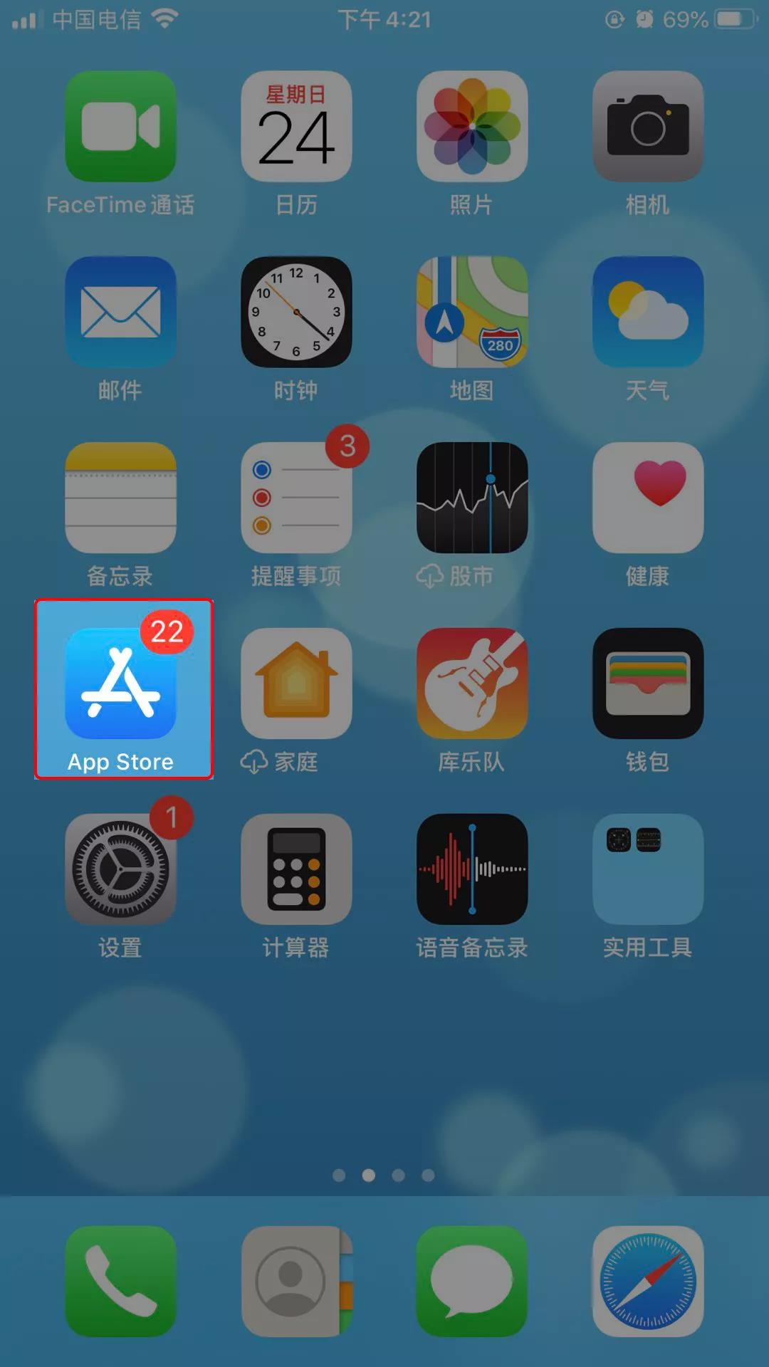 首先在手機(jī)找到App Store(蘋(píng)果手機(jī)唯一的軟件下載商店)
