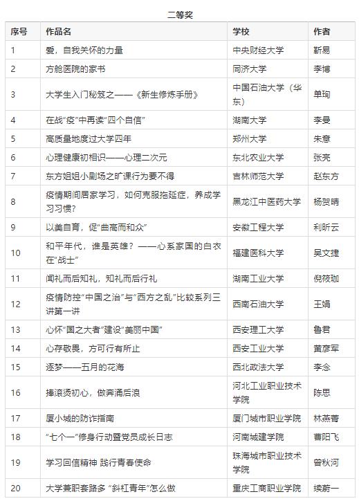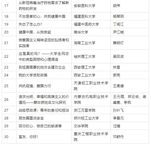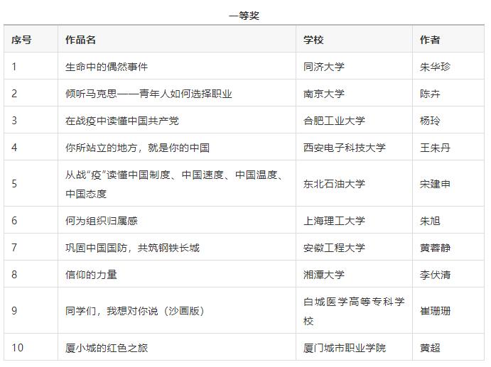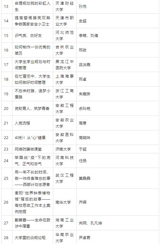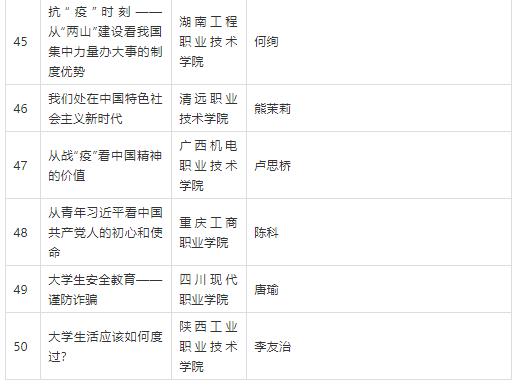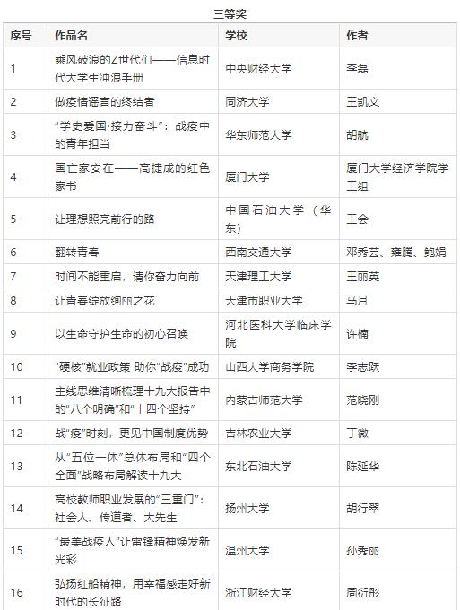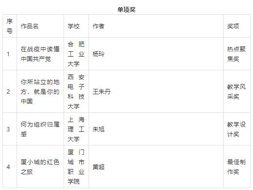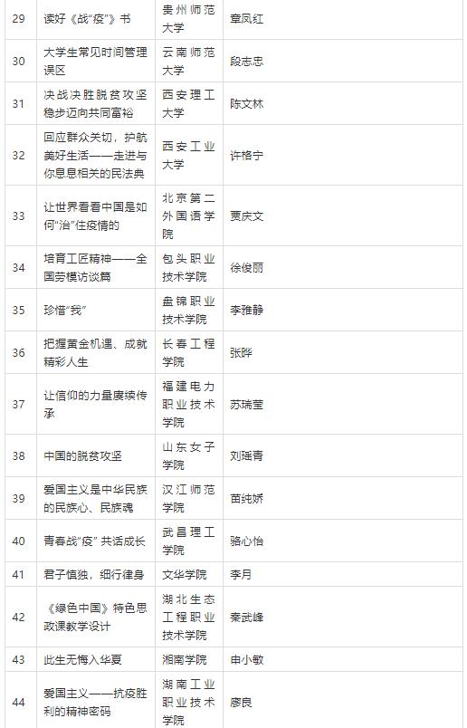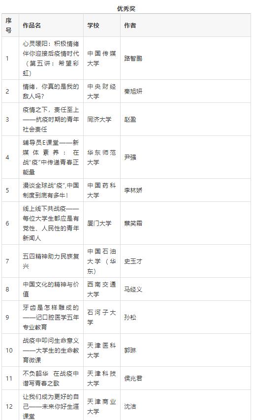 在教育部思政司精心指導(dǎo)和全國高校積極參與下,由高校思想政治工作隊伍培訓(xùn)研修中心(高等教育出版社)、全國高校思想政治工作網(wǎng)、高校輔導(dǎo)員網(wǎng)絡(luò)培訓(xùn)中心聯(lián)合舉辦的2020年度全國高校思想政治工作“金微課”征集活動現(xiàn)已完成作品征集與專家評審,共遴選出一等獎10件、二等獎20件、三等獎30件、優(yōu)秀獎50件,以及熱點聚焦獎、教學(xué)設(shè)計獎、教學(xué)風(fēng)采獎、最佳制作獎等單項獎各1件,現(xiàn)將獲獎名單予以公示。