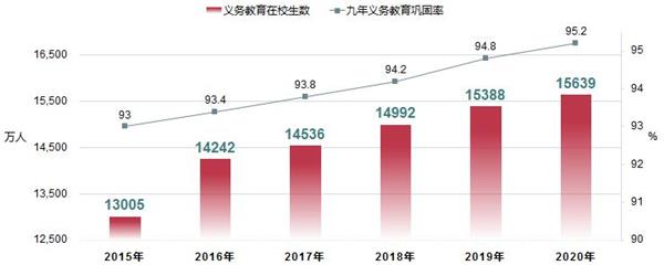 2020年,全國共有義務(wù)教育階段學(xué)校21.08萬所。招生3440.19萬人,在校生1.56億人。專任教師1029.49萬人。九年義務(wù)教育鞏固率95.2%。