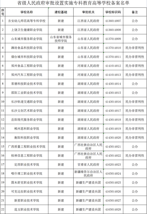 根據(jù)《中華人民共和國(guó)高等教育法》《普通高等學(xué)校設(shè)置暫行條例》等有關(guān)法律法規(guī)和政策文件的規(guī)定,現(xiàn)將省級(jí)人民政府審批新設(shè)的專(zhuān)科層次高等學(xué)校備案名單予以公布。
