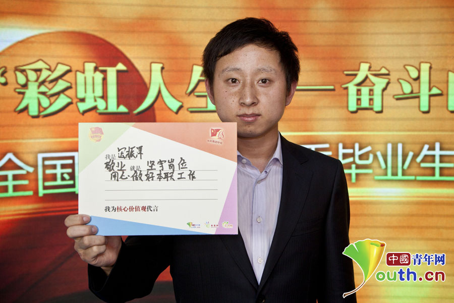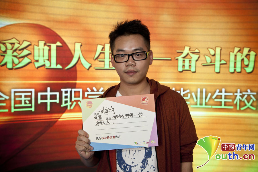 “彩虹人生——奮斗的青春最美麗”分享團(tuán)成員,上海柏悅酒店冰雕師李曉君寫下自己的“價(jià)值觀體”?!?/span>