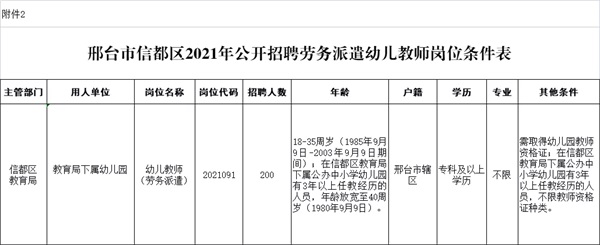 2.《邢臺市信都區(qū)2021年公開招聘勞務派遣幼兒教師崗位條件表》